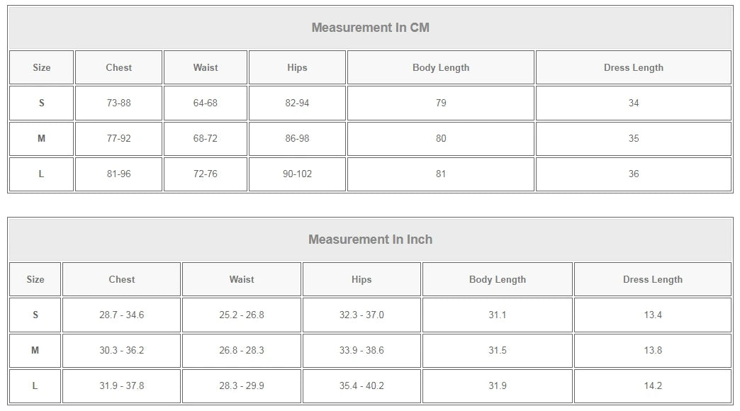 S: Chest 73–88 | Waist 64–68 | Hips 82–94 | Body Length 79 | Dress Length 34